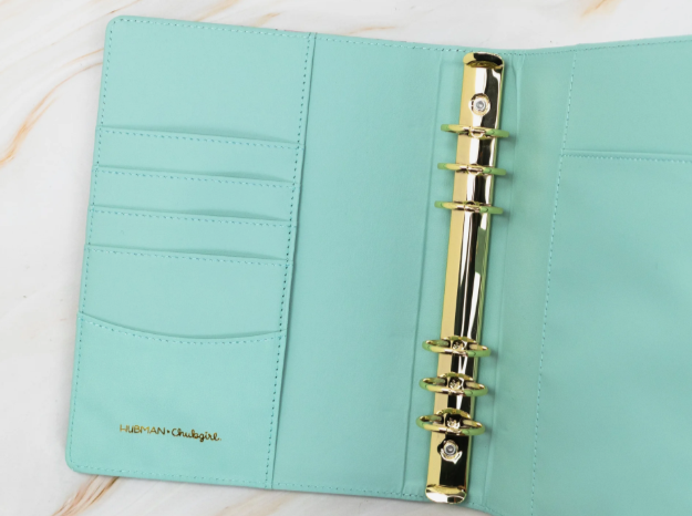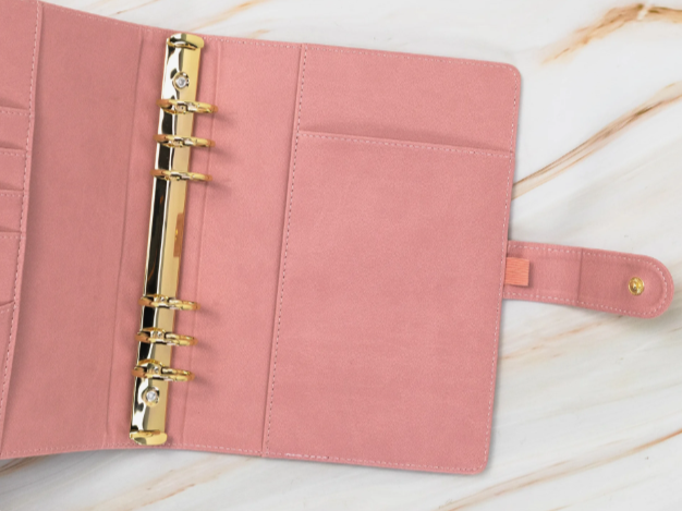 Stay organized and plan wherever you go with our 6-ring planner. Made of vegan leather and secured with a button closure, you can customize the inner sheets layout to suit your planning needs! Use the pockets on the inside and pen holder to carry your supplies and plan on the go!