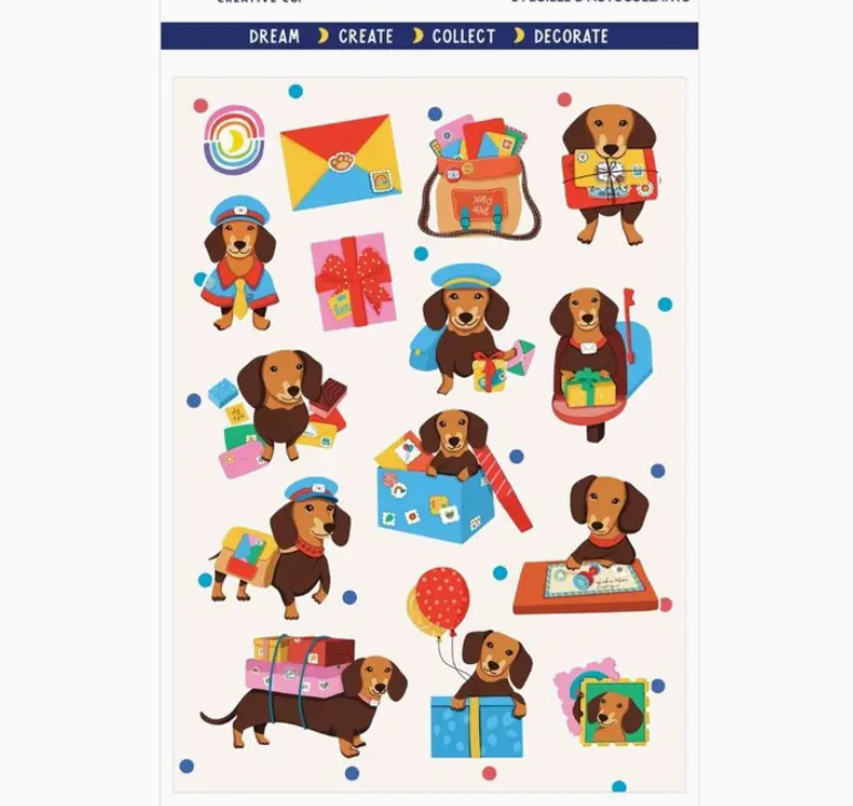 This delightful dachshund is on delivery duty to make sure your sticker mail and presents arrive with extra joy!