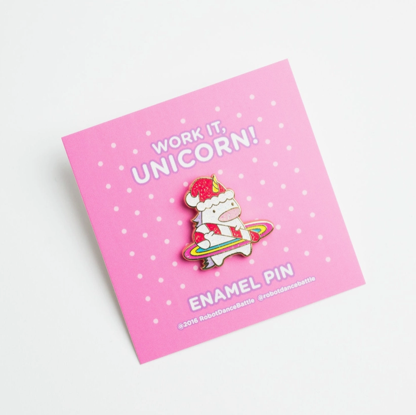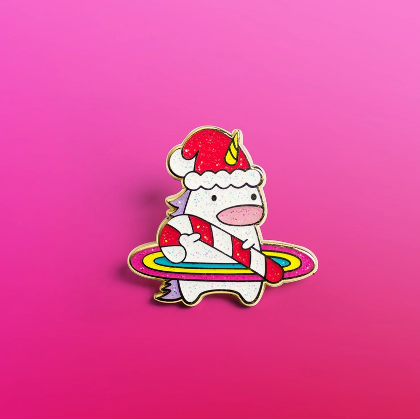 The unicorn enamel pin is ready for the holidays and holding a candy cane!
